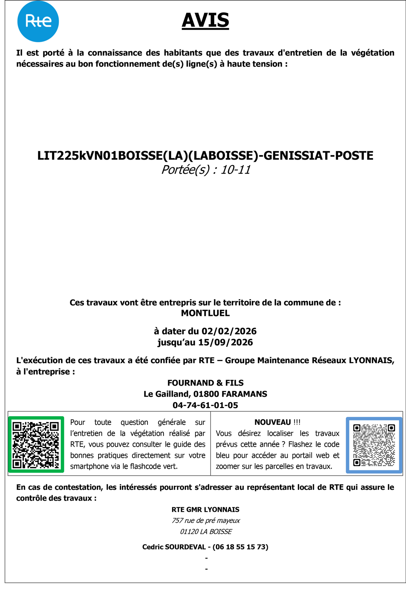 Des travaux d'élagage et d'abattage vont être entrepris du 2/2/2026 au 15/9/2026 sur le territoire de la commune, afin d'assurer le bon fonctionnement des lignes hautes tension.