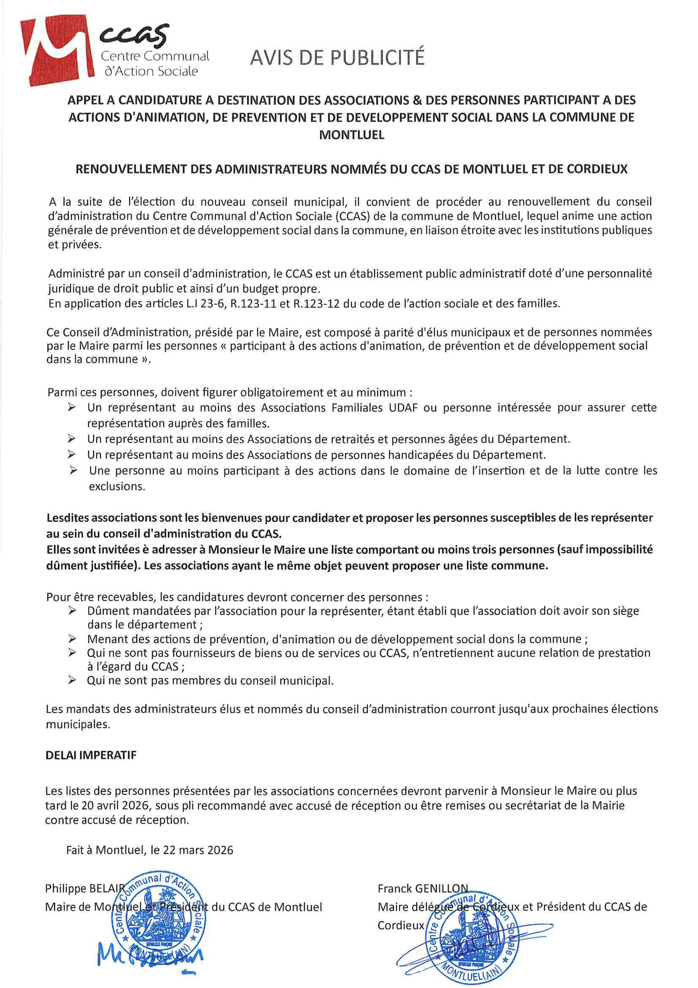 Avis de publicité - CCAS de Montluel et de Cordieux